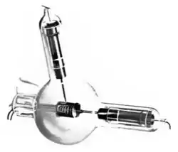 В 1918 года научный сотрудник General Electric Альберт Халл предложил новый тип вакуумной лампы — динатрон (англ. dynatron).[2] До своего прихода в радиотехнику Халл изучал греческую филологию и впоследствии называл свои изобретения греческими именами: динатрон, плиотрон, тиратрон, магнетрон и т. п.[3] Динатрон имел три электрода — спиральный катод прямого накала, окружающий его перфорированный цилиндр первого анода и внешний, сплошной, цилиндр второго анода. Первый анод динатрона внешне походил на сетку обычного триода («аудиона» де Фореста), но, в отличие от триода, на него следовало подавать положительное напряжение смещения. При определённом соотношении напряжений на анодах рост напряжения на втором аноде приводил к снижению тока через него. Халл предлагал использовать одиночные динатроны в качестве генераторов высокочастотных колебаний, а двойки из непосредственно-связанных динатронов — как неинвертирующие усилители.