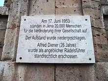 17 июня 1953 года в Йене акции протеста собрали около 20 тыс. человек. Альфред Динер принял участие в штурме здания окружного управления СЕПГ в Йене и входил в группу демонстрантов на переговорах с представителями местного партийного руководства. Около 14:00 группа, в которую также входил Вальтер Шелер, была арестована советскими военными.