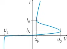 С S-образной ВАХ связано явление гистерезиса: при увеличении напряжения прибор находится в запертом состоянии до достижения напряжения включения при уменьшении тока через прибор остается в открытом состоянии до достижения напряжения удержания причём
