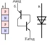 Функционирует как тиристор, но не имеет управляющего электрода, включение в проводящее состояние происходит при превышении прямого напряжения на приборе свыше напряжения отпирания.