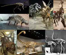 1-й ряд (сверху вниз): Heterodontosaurus tucki, Scolosaurus thronus, Allosaurus fragilis и Stegosaurus stenops, Edmontosaurus annectens.