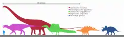 Четвероногие травоядные зауроподы и вовсе регулярно достигали длины 25—35 метров (диплодоки, аргентинозавр, суперзавр, завропосейдон). Высказаны предположения о существовании ещё более крупных зауропод[80], но их существование пока остаётся под сомнением.