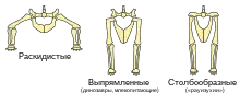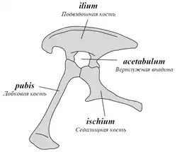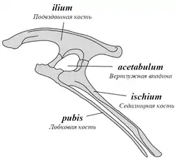 Ранние ящеротазовые сохранили структуру бедра своих предков с лобковой костью, направленной краниально или вперёд[12]. Эта основная форма была модифицирована поворотом лобковой кости назад в различной степени в нескольких группах (герреразавр[17], теризинозавроиды[18], дромеозавриды[19] и птицы[20]). К ящеротазовым относят две группы[16]: