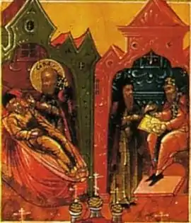 ![]() Явление преподобного Саввы игумену Дионисию. Дионисий пишет первую икону Саввы (клеймо иконы «Преподобный Савва Сторожевский с житием», 1835 год. Государственный Русский музей) | |