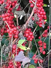 Плоды — шаровидные красные ягоды. Плодоносит с июля до октября.