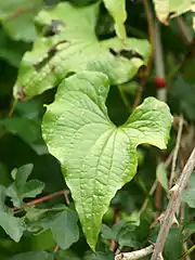 Листорасположение очерёдное, листья похожи на листья диоскореи кавказской, но голые снизу.