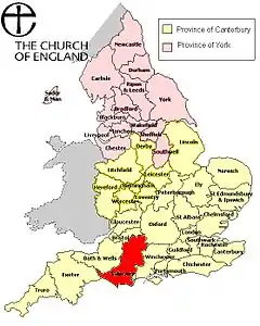 Карта диоцезов Церкви Англии, на которой диоцез Солсбери показан красным цветом.