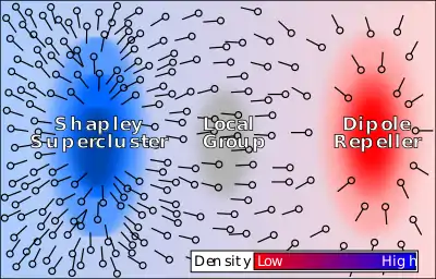 Помимо того, что нас притягивает к известному сверхскоплению Шепли, нас также отталкивает недавно обнаруженный Дипольный отталкиватель. Таким образом, оказалось, что притяжение и тяга имеют сравнимое значение там, где расположена наша Галактика.[10]