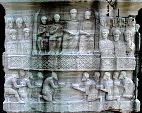 Тема варваров, оказывающих дань уважения императору, часто встречается в римских и византийских барельефах — в данном случае это лат. aurum coronarium, подношение дани. Варвары позволяли показать милосердие императора и подчеркнуть символизм его победы. На одном из двух фрагментов консульского диптиха Василия (541), хранящегося в миланской галерее Брера, представлен тот же мотив[20][21]. Он также может быть обнаружен в Константинополе, например, в основании колонны Аркадия (с аналогичной композицией) или на обелиске Феодосия на ипподроме[22]. На обелиске Феодосия десять варваров, также разделённые на две группы, сходятся к центральной фигуре императора, в данном случае сидящего величественно на троне в императорской ложе и окружённого другими августами. Слева персы, справа неопределимые западные варвары, возможно германцы или готы. Победа отсутствует на этом рельефе, но она присутствовала на утраченной части основания колонны Аркадия и на утраченном основании колонны Константина — в обоих случаях Победа находилась в центре композиции, выступая своего рода посредником между побеждёнными варварами и фигурой императора, расположенной ниже.