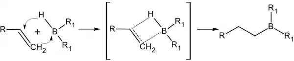 Присоединение дисиамилборана к тройной связи происходит по аналогичному механизму, однако отдельно стоит отметить, что скорость присоединения дисиамилборана по тройной связи на несколько порядков выше. Дальнейшее присоединение дисиамилборана не идёт по стерическим причинам (углеводородные радикалы первой молекулы «мешают» присоединению второй). На этом основано лабораторное получение цис-алкенов сложного строения. Образующийся триалкилборан подвергают воздействию уксусной кислоты, в результате чего с выходом около 99 % образуется цис-изомер соответствующего алкена (происходит гидрирование алкин->цис-алкен)[2][3].