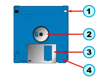 Классический вид дискеты. Принципиальное отличие дискеты 3½ дюйма – жёсткий пластмассовый корпус. Вместо индексного отверстия в дискетах диаметром 3½ дюйма используется металлическая втулка с установочным отверстием, которая находится в центре дискеты. Механизм дисковода захватывает металлическую втулку, а отверстие в ней позволяет правильно позиционировать дискету, поэтому отпала необходимость делать для этого отверстие непосредственно в магнитном диске. В отличие от 8- и 5-дюймовых дискет, окно для головок дискеты 3½ дюйма закрыто шторкой из металла или пластмассы, которая сдвигается в сторону специальным рычагом во время установки дискеты в дисковод. Защита от записи производится небольшой сдвигающейся пластиковой шторкой в нижнем левом углу дискеты — открытое окошко соответствует активированной защите. В правом нижнем углу находятся окошки, позволяющие схеме дисковода определить плотность записи на дискету: