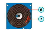 Дискета 5,25 дюйма в разобранном виде (с раскрытым футляром): 1 — футляр; 2 — антифрикционные прокладки; 3 — окно для шпинделя привода; 4 — окно индексного отверстия; 5 — окно для магнитных головок; 6 — полимерный диск с магнитным покрытием; 7 — отверстие для шпинделя привода; 8 — индексное отверстие; 9 — выемка защиты от записи