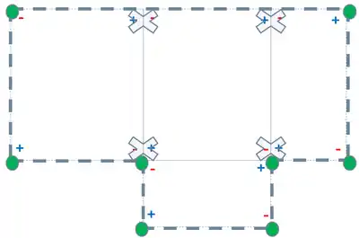 Это изображение показывает, как + \ — коэффициенты первоначальной функции взаимно сокращаются в прямоугольниках, кроме точек расположенных в углах данной области.