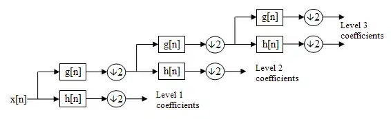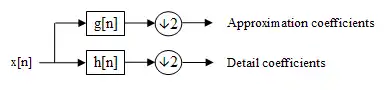 ДВП сигнала получают применением набора фильтров. Сначала сигнал пропускается через низкочастотный (low-pass) фильтр с импульсным откликом , и получается свёртка:
