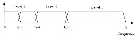 Это разложение можно повторить несколько раз для дальнейшего увеличения частотного разрешения с дальнейшим прореживанием коэффициентов после НЧ и ВЧ-фильтрации. Это можно представить в виде двоичного дерева, где листья и узлы соответствуют пространствам с различной частотно-временной локализацией. Это дерево представляет структуру банка (гребёнки) фильтров.