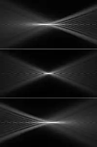 | Сечение фокусирующегося пучка лучей от объектива при различной сферической аберрации: вверху — отрицательная, по центру — отсутствует, снизу — положительная. Объектив расположен слева от фокуса. | |
