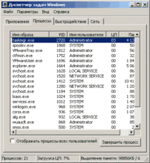 - Процессы. Разнообразные данные обо всех запущенных в системе процессах, можно завершать, менять приоритет, задавать соответствие процессорам (в многопроцессорных системах)