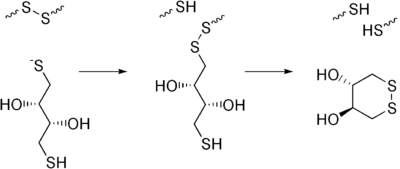 Дитиотреитол — очень сильный восстанавливающий агент, способный формировать шестичленное кольцо путём образования внутримолекулярной дисульфидной связи. При рН 7 имеет восстановительный потенциал −0,33 В. Восстановление дисульфидных связей осуществляется путём двух последовательных тиол-дисульфидных обменов (см. ниже). Интермедиат нестабилен, так как вторая тиоловая группа имеет склонность к закрытию кольца и образованию окисленного ДТТ, при этом образуются две восстановленные дисульфидные связи. ДТТ проявляет восстанавливающую активность только при рН около 7, так как только отрицательно заряженный тиолят может образовывать активный -S-, в то время как протонированная тиоловая форма -SH неактивна. Константа кислотности тиоловой группы лежит между значениями рН от 9,2 до 10,1.