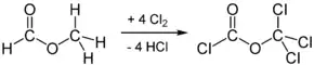 Дифосген также может быть синтезирован радикальным хлорированием метилформиата при облучении ультрафиолетом: