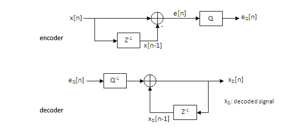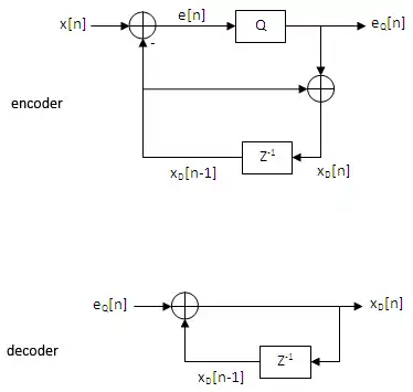 Кодер играет роль дифференциатора (квантователь должен предшествовать дифференциатору), а декодер выступает в качестве аккумулятора.