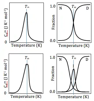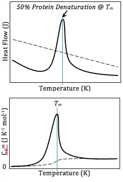 Дифференциальная сканирующая калориметрия также может быть использована для получения ценной термодинамической информации о белках. Термодинамический анализ белков может выявить важную информацию о глобальной структуре белков и взаимодействии белок/лиганд. Например, многие мутации снижают стабильность белков, тогда как связывание лигандов обычно увеличивает стабильность белков.[8] Используя ДСК, эту стабильность можно измерить путём получения температурной зависимости значения свободной энергии Гиббса. Это позволяет исследователям сравнивать свободную энергию разворачивания между белком без лигандов и комплексом белок-лиганд или естественными и мутантными белками. ДСК также можно использовать при изучении белково-липидных взаимодействий, нуклеотидов, а также лекарственно-липидных взаимодействий.[9] При изучении денатурации белков с использованием ДСК наблюдаемые термические превращения должны быть, по крайней мере, до некоторой степени обратимыми, поскольку термодинамические расчеты основаны на химическом равновесии.