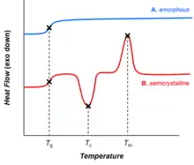 По мере повышения температуры аморфное твёрдое вещество становится менее вязким. В какой-то момент молекулы могут получить достаточно свободы движения, чтобы самопроизвольно упорядочиться в кристаллическую форму. Это известно как температура кристаллизации (Tc). Этот переход от аморфного твёрдого вещества к кристаллическому твёрдому веществу является экзотермическим процессом и приводит к возникновению пика сигнала ДСК. По мере повышения температуры образец в конечном итоге достигает своей температуры плавления (Tm). Процесс плавления приводит к эндотермическому пику на кривой ДСК. Способность определять температуры и энтальпии фазовых переходов делает ДСК ценным инструментом для создания фазовых диаграмм различных химических систем.[4]