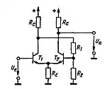 Для уменьшения искажений, расширения апертуры и балансировки плеч в биполярную дифференциальную пару вводится локальная отрицательная обратная связь (ООС) по току[57][20][58]. Две её конфигурации — с двумя эмиттерными резисторами («соединение звездой»), либо с одним эмиттерным резистором и двумя источниками тока («соединение треугольником»), — эквивалентны[57] за единственным исключением: в каскаде с симметричным выходом схема «треугольником» проигрывает схеме «звездой» по шумам[59]. Эффективность ООС характеризуется её коэффициентом