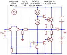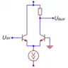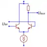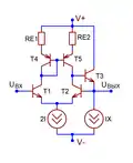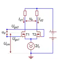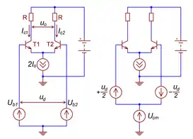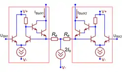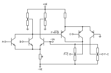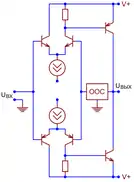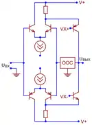 В обоих случаях каскад превращается в генератор разностного тока , который направляется в высокоомную внешнюю цепь, при этом напряжения покоя на коллекторах или стоках дифференциальной пары не определены[70][68]. Чтобы избежать «залипания» каскада в одном из двух крайних положений, его рабочая точка устанавливается принудительно — петлёй глобальной обратной связи, цепью автоматического регулирования тока эмиттеров дифференциальной пары[71] или тока активной нагрузки[72].