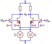 Альтернативный способ линеаризации каскада, не ухудшающий отношение сигнал-шум, применяется в биполярной интегральной схемотехнике[61]. Усовершенствованный каскад состоит из двух параллельно включённых дифференциальных пар, в каждой из которых площади эмиттерных переходов транзисторов различаются в 4 раза[64]. При таком соотношении площадей третьи гармоники выходного тока, генерируемые двумя парами, взаимно подавляют друг друга[64][комм. 13] . По сравнению с обычным дифференциальным каскадом, потребляющим от источника питания тот же ток , усовершенствованный каскад отличается