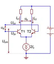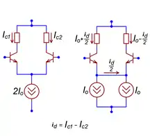 Если напряжения на базах транзисторов не равны, то есть на общее синфазное напряжение накладывается дифференциальная составляющая , то общий ток перераспределяется между транзисторами. Тот из них, на базу которого подано бо́льшее управляющее напряжение (с учётом полярности транзисторов), перехватывает бо́льшую часть общего тока[16]. При малых значениях каскад является высоколинейным управляемым источником тока — преобразователем дифференциального напряжения в ток с крутизной преобразования , точно равной крутизне характеристики каждого транзистора в выбранной рабочей точке :