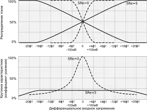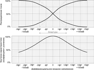 Если бы крутизна преобразования напряжения в ток была постоянной, то при один из транзисторов перехватил бы 100 % общего тока, а другой бы закрылся. На границах области линейного усиления, называемой апертурой ограничения (), происходил бы резкий переход к амплитудному ограничению (клиппингу) сигнала[18]. В реальных усилительных приборах крутизна не остаётся неизменной, поэтому переход от усиления к ограничению сигнала — если не сказываются внешние факторы, вызывающие преждевременную перегрузку — происходит плавно. Характер этого перехода зависит от типа применённых приборов и от принятых мер по линеаризации передаточной характеристики.