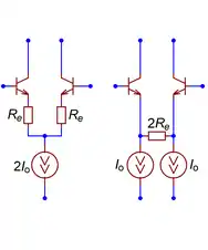 Два идентичных транзистора или триода дифференциальной пары питаются общим током [комм. 3], заданным внешним источником — в его роли может выступать активный источник тока либо резистор достаточно большой величины.