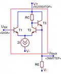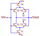 - , где — выходные сопротивления транзисторов, — их напряжения Эрли[73][74][75].