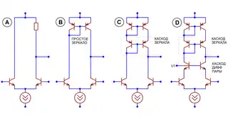 - в каскаде с несимметричным выходом — на токовое зеркало (схема B)[69].