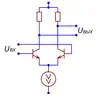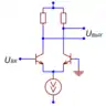 - , где — внутреннее сопротивление общего источника тока[43], а максимальный коэффициент ослабления синфазного сигнала [44][45] (порядка 60 дБ[46]).