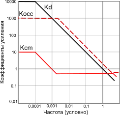 Приведённые выше формулы и оценки справедливы лишь на низких частотах[48]. На практике частотная характеристика коэффициента дифференциального усиления достаточно точно аппроксимируется фильтром нижних частот первого порядка c постоянной времени , складывающейся из двух частей: