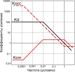 АЧХ коэффициента усиления синфазного напряжения имеет более сложный характер, так как в модели каскада возникает частотнозависимая обратная связь[53]; в зависимости от её относительной эффективности может и возрастать с частотой, и спадать[54]. Для каскада, нагруженного на сопротивления, характерен первый вариант: на нижних частотах возрастает и затем, достигнув частоты среза , стабилизируется; на высоких частотах, вплоть до частоты единичного усиления дифференциального сигнала, спадает, причём его величина вдвое превосходит [55]. В сложных каскадах c особо высоким на низких частотах возрастание не наблюдается[55].