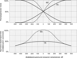 - в полтора раза меньшим коэффициентом усиления дифференциального напряжения[64],