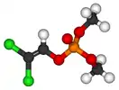 Дихлофо́с (O,O-диметил-O-2,2-дихлорвинилфосфат, ДДВФ)[3] — фосфорорганическое соединение, инсектицид широкого спектра применения. В силу своей относительной безопасности для человека применяется для уничтожения насекомых в быту и на производстве (в основном — тараканов, моли, различных бабочек). Синтезируют дегидрохлорированием хлорофоса. Это вещество оказывает на вредителей нервно-паралитическое действие.