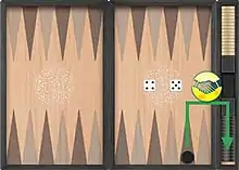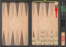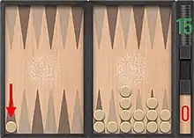 | Ничья | Понятие ничьи в длинных нардах в их классическом виде, существовавшем многие века, отсутствует. Изначально игра была задумана как бескомпромиссный спор, в котором кто-то обязательно должен выиграть. Понятие ничьи в длинных нардах введено Федерацией Нард и практикуется уже много лет в очных турнирах. По правилам Федерации игру всегда начинают белые. Когда один игрок, игравший белым цветом, выбросил все свои шашки, второй игрок, игравший чёрным цветом, имеет право последнего броска. Возможна ситуация, когда игрок, игравший чёрным цветом, использовав своё право последнего броска, тоже выбросил все свои шашки. В этом случае партия заканчивается вничью, и игроки получают по пол очка (1/2-1/2), либо по одному очку (1-1), в зависимости от Регламента турнира. | ![]() Ничья |