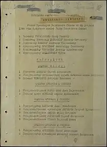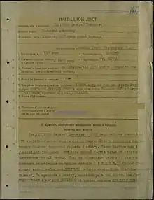 | Фрагмент Указа Президиума Верховного Совета СССР от 21 февраля 1944 года | Представление к званию Героя Советского Союза, лист 1 | Представление к званию Героя Советского Союза, лист 1 |
