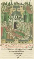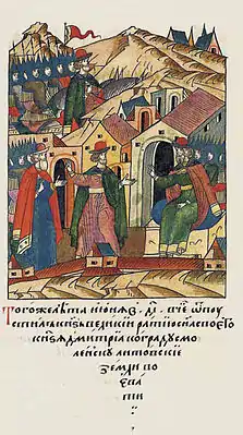 ![]() «В то же лето июня в 14 день в четверг отпустил великий князь с ратью своего сына князя Дмитрия к городу Смоленску завоевывать литовские земли» | |