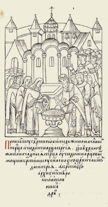 родился у великие царици Анастасии царевич князь Дмитрей. С тем сеунчем гонял встречю царю и великому князю Василей Юрьевич Малой Трахиниот («Краткий летописец»)