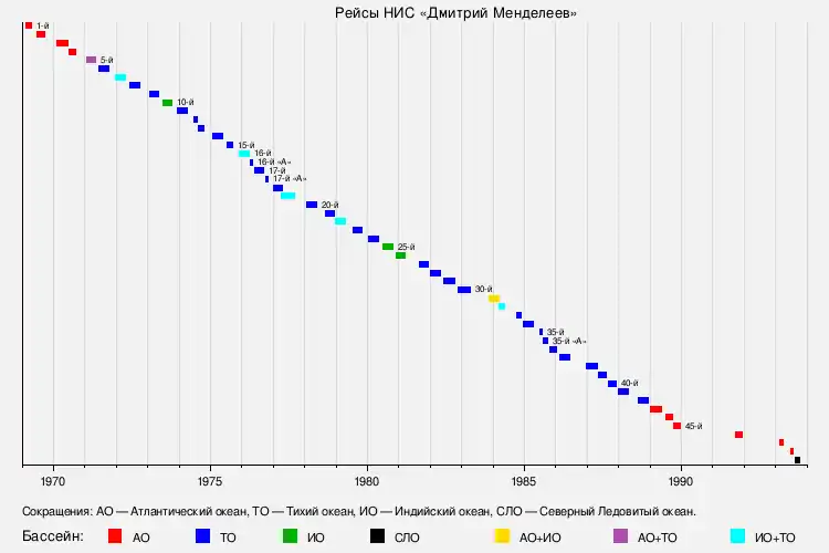 За 25-летнюю историю научной деятельности, с 1969 по 1993 гг. НИС «Дмитрий Менделеев» совершило 51 научный рейс (точнее 49 научных рейсов и три подрейса, из которых два научных и один технический) в различные районы Мирового океана[9].