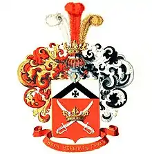 В красном щите золотая дворянская корона. Сквозь неё продеты накрест остриями вверх две серебряные сабли. В серебряной главе щита чёрное стропило, над ним чёрный крест с широкими концами. Над щитом дворянский коронованный шлем. Нашлемник: три страусовых пера: среднее — красное, правое — серебряное, левое — золотое. Намёт справа красный. подложен золотом, слева чёрный. подложен серебром. Девиз: «ВЕРА, ВЕРНОСТЬ, ТРУД» золотыми буквами на красной ленте. Герб внесён в Часть XVI. ОГДР стр. 140[2].