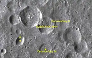 ![]() Снимок зонда Lunar Reconnaissance Orbiter. Кратер Добровольский справа, слева от него кратер Ширакаци. | |