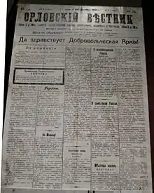 Единственной газетой, которая печаталась в Орле при белогвардейцах, стал «Орловский вестник». Ранее эта газета уже выходила в Орле в период Российской империи (в частности, именно в ней состоялся литературный дебют И. А. Бунина) и межреволюционные годы, но при большевиках была закрыта. На момент восстановления «Орловский вестник» позиционировал себя в качестве «газеты общественной жизни, литературы, политики и торговли». Газета продавалась по цене 2 рубля 50 копеек. Её контора и редакция располагались на Болховской улице, в доме Домогатского. Возглавлял редакцию некто Афанасьев[13].