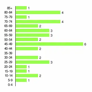 | Жителей | 814 | 983 | 1066 | 794 | 325 | 134 | 70 | 51 | 38 |