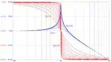 В данном случае R является входным сопротивлением параллельного контура. Однако практически для электрической цепи гораздо проще измерить ток или напряжение, чем энергию или мощность. Поскольку мощность и энергия пропорциональны квадрату амплитуды колебаний, ширина полосы частот на АЧХ определяется на высоте от высоты максимума (примерно −3 дБ). Поэтому чаще используется другое эквивалентное определение добротности, которое связывает ширину амплитудной резонансной кривой по уровню с круговой частотой резонанса