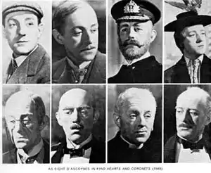 - Алек Гиннесс — герцог / банкир / пастор / генерал / адмирал / молодой Аскойн / молодой Генри / леди Агата